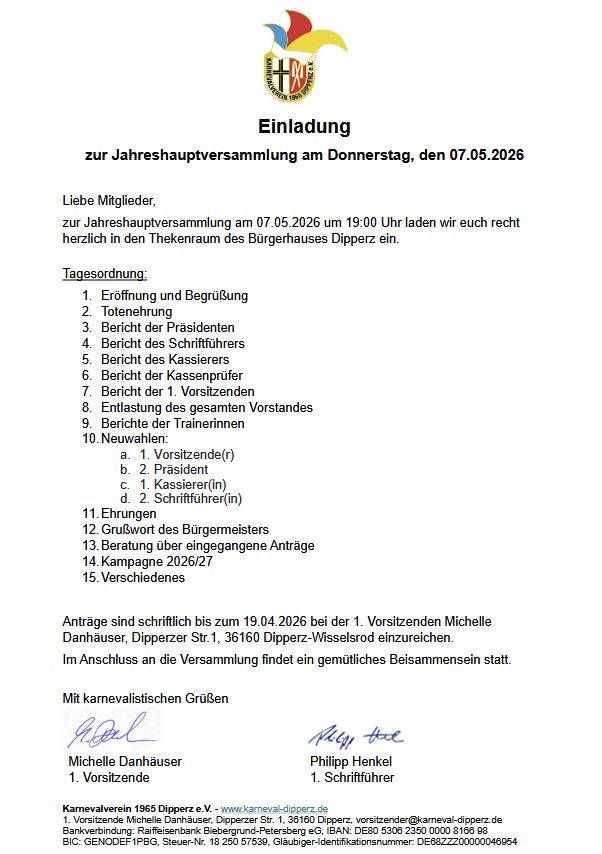 07.05.2026 – Jahrehauptversammlung um 19.00 Uhr im BGH Dipperz